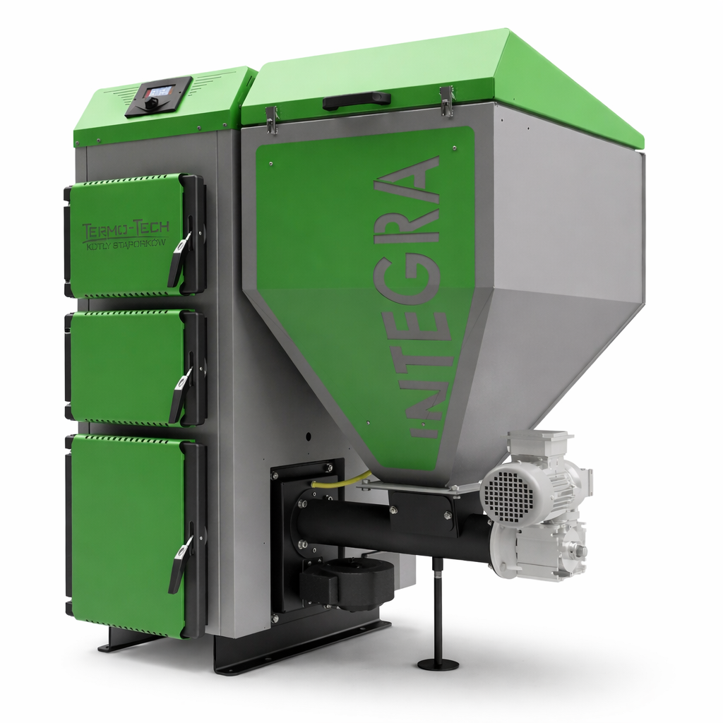 Stalowe kotły typu Integra z nowym, opatentowanym palnikiem retortowym, wykonanym z wysokiej jakości żeliwa szarego, przeznaczone są do wodnych instalacji centralnego ogrzewania w układach systemu otwartego, jak również zamkniętego (po zamontowaniu wężownicy schładzającej wraz z zaworem BVTS). Kotły stanowią konstrukcję stalową spawaną z atestowanych blach kotłowych o grubości 6 mm, gwarantujących długotrwałe użytkowanie. Przeznaczone są do spalania ekogroszku o granulacji 5-25 mm. Obsługa kotła ogranicza się do rozpalenia paleniska automatycznego oraz usuwania popiołu. Automatyczne palenisko zasilane jest cyklicznie niewielkimi porcjami paliwa bezpośrednio na ruszt retortowy, zaś wentylator nadmuchowy dostarcza precyzyjnie dobraną ilość powietrza w określone strefy paleniska. Pozwala to uzyskać wysoką efektywność procesu spalania oraz niezwykle niską emisje substancji szkodliwych do atmosfery. Nad prawidłowym przebiegiem procesu spalania i utrzymaniem zadanej temperatury kotła czuwa mikroprocesorowy regulator z innowacyjnym oprogramowaniem. Sterownik obsługuje pompy c.o., c.w.u. i pompę dodatkową. Możliwość podłączenia regulatora pokojowego oraz modułów ST-65 GSM, ST-500 Ethernet (sterowanie przez Internet) i ST-61 (możliwość sterowania dwoma zaworami).