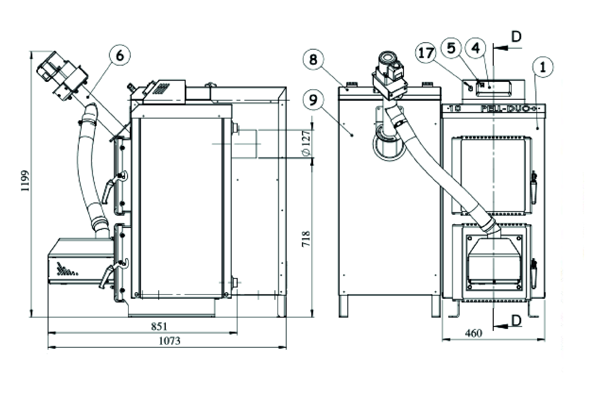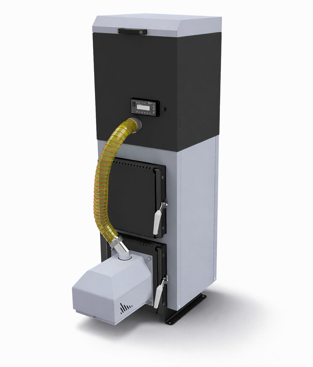 Kotły typu Pell-Duo+ przeznaczone są do wodnych instalacji centralnego ogrzewania systemu otwartego, z grawitacyjnym jak i wymuszonym obiegiem wody. Instalacja musi być zabezpieczona zgodnie z obecnie obowiązującymi, szczegółowymi przepisami krajowymi. Stalowe kotły grzewcze typu Pell-Duo+ z automatycznym układem podawania paliwa są przeznaczone do pracy w instalacjach centralnego ogrzewania i przygotowania ciepłej wody użytkowej w obiektach budownictwa mieszkaniowego tj. domach jednorodzinnych, pawilonach handlowych, garażach, budynkach gospodarczych. Pell-Duo+ to kompaktowe kotły na pellet z automatycznym rozpalaniem i wygaszaniem. Wyposażone zostały w samoczyszczący palnik ze stali żaroodpornej. W pionowym wymienniku zastosowano innowacyjne rozwiązanie a mianowicie popielnik wyczystny, który spełnia rolę izolatora spodu kotła, co znacząco podnosi sprawność cieplną kotłów. Sterownik kotłów to urządzenie wykonane w zaawansowanej technologii, przystosowane do obsługi energooszczędnych pomp elektronicznych. Sterownik obsługuje pompy: c.o., c.w.u. oraz siłownik zaworu. Możliwość podłączenia regulatora pokojowego oraz modułu SafeIT (sterowanie przez Internet).